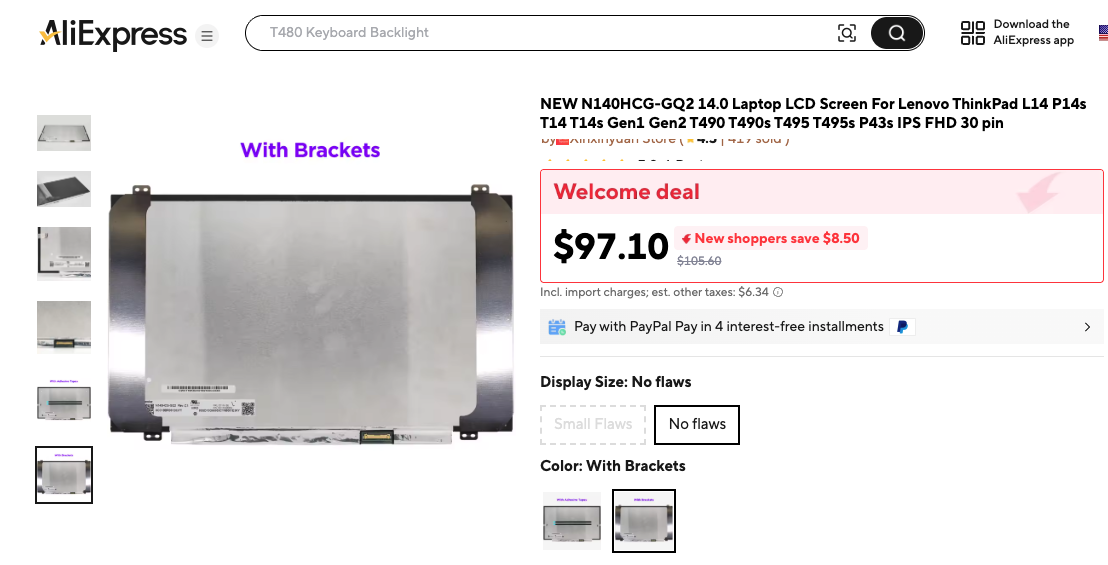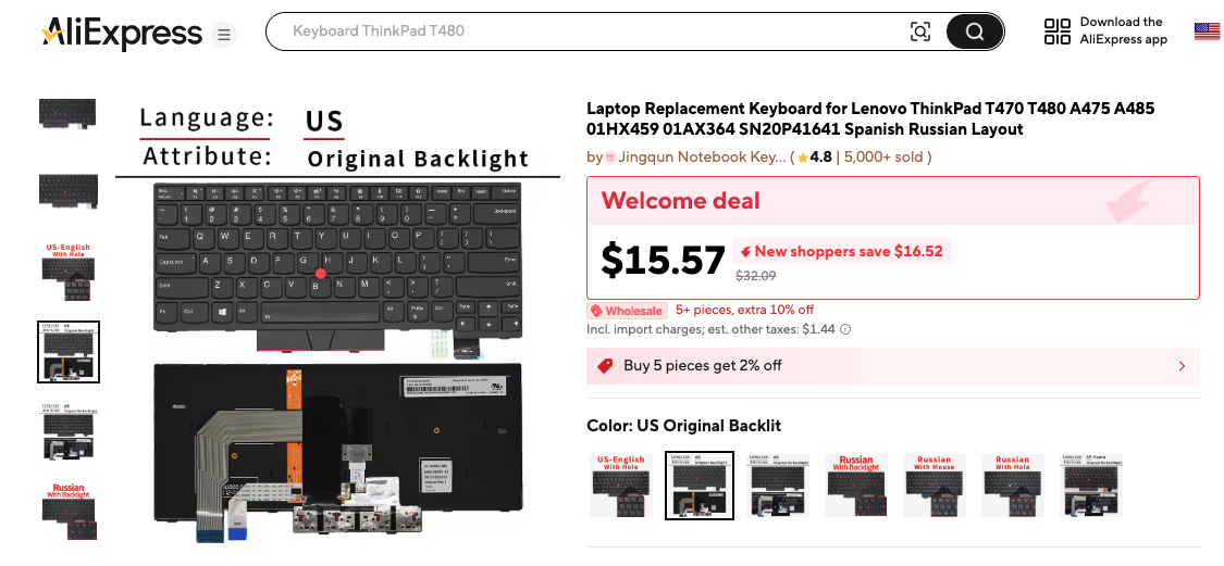 The original keyboard was gross, greasy, crumb-filled, and not even backlit. I bought a US-layout backlit keyboard from AliExpress. The price difference between eBay and AliExpress wasn’t much, but since I was already ordering the screen from there, I figured I could wait a bit longer and save ten bucks.